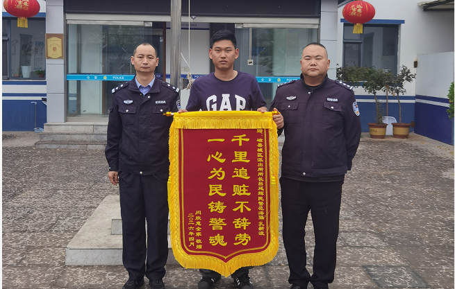4月8日上午,群众闫某某来到磁县公安局城区派出所,将一面印有“千里追赃不辞劳 一心为民铸警魂”的锦旗送到办案民警手中,以表示对公安机关快速破案,为其挽回损失诚挚感激之情。