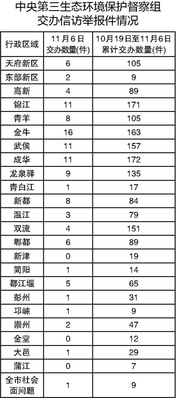 从区域分布上看,天府新区6件;东部新区2件;高新4件;锦江11件;青羊8件;金牛16件;武侯11件;成华11件;龙泉驿9件;青白江1件;新都8件;温江3件;双流4件;郫都6件;简阳1件;都江堰5件;彭州1件;邛崃1件;崇州2件;大邑1件;全市社会面问题1件。所有举报件均已及时转交相关区(市)县和部门处理。