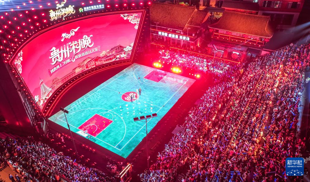2月3日,观众在台江县台盘乡“村BA”球场观看贵州“村晚”(无人机照片)。 2月3日晚,2026贵州“村晚”主会场活动在黔东南苗族侗族自治州台江县“村BA”球场录制拍摄。“村晚”现场给观众带来“村BA”“村超”...
